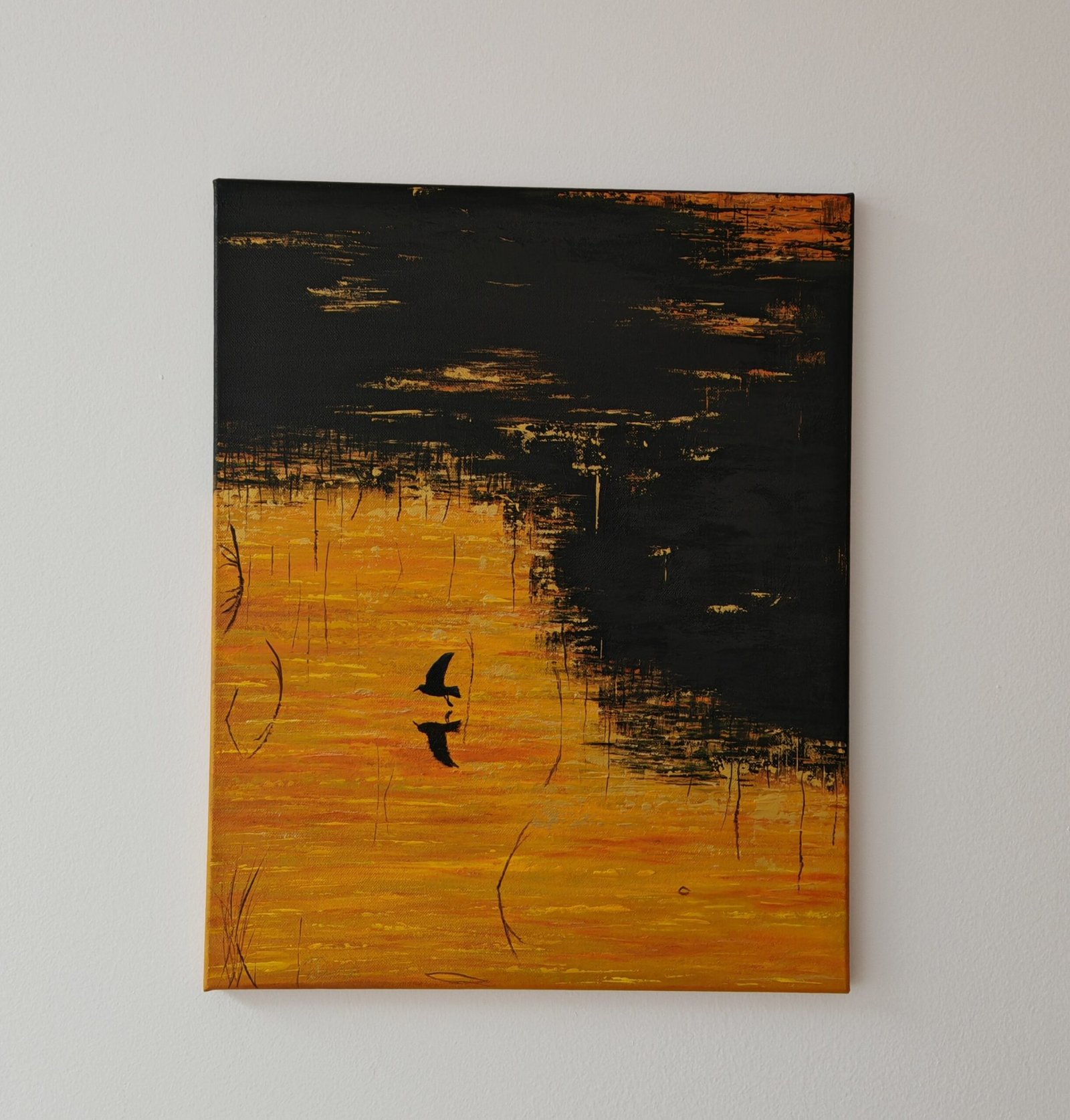 The painting “LAKE TINTED BY SUNSET II” is made of acrylic on canvas.